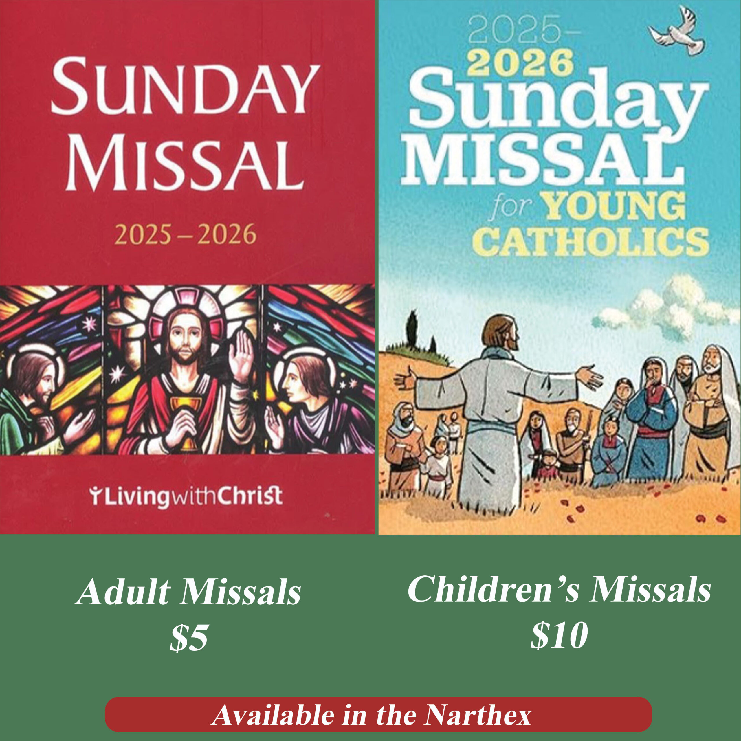 Sunday Missals for the upcoming liturgical year are now available in the Narthex. Adult Missals • $5 Children’s Missals • $10