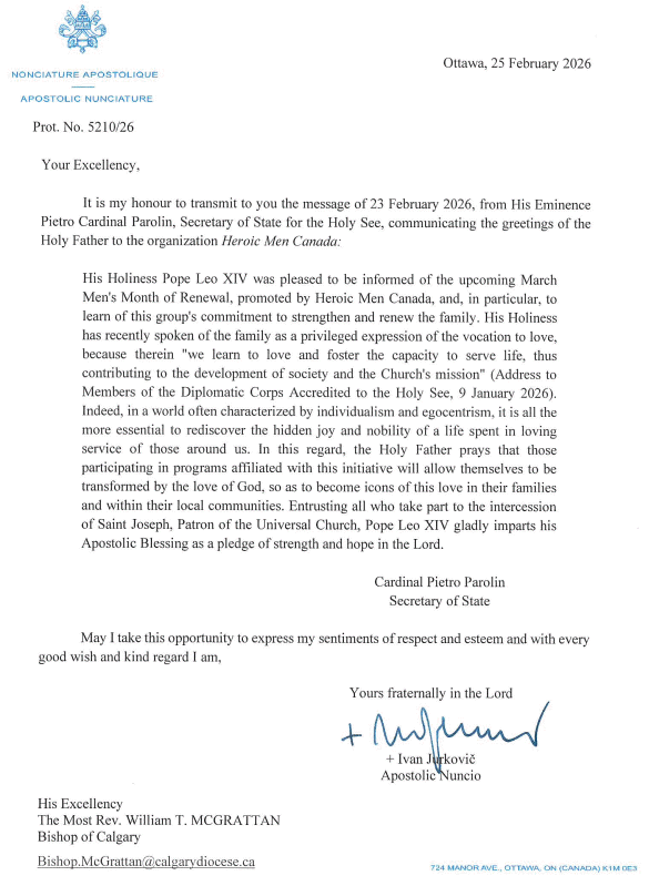 Vatican City, 28 February 2026 – In a special message dated 23 February 2026, His Eminence Cardinal Pietro Parolin, Secretary of State, conveyed the personal greetings and Apostolic Blessing of His Holiness Pope Leo XIV to Heroic Men Canada on the occasion of their upcoming March Men’s Month of Renewal.